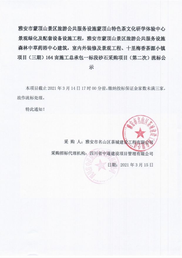 雅安市蒙頂山景區(qū)旅游公共服務(wù)設(shè)施蒙頂山特色茶文化研學(xué)體驗中心景觀綠化及配套設(shè)備設(shè)施工程,雅安市蒙頂山景區(qū)旅游公共服務(wù)設(shè)施森林中草藥浴中心建筑,室內(nèi)外裝修及景觀工程、十里梅香茶源小鎮(zhèn)項目(三期)164畝施工總承包一標(biāo)段砂石采購項目(第二次)流標(biāo)公示