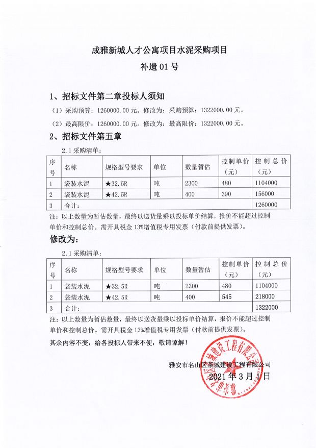 成雅新城人才公寓項(xiàng)目水泥采購項(xiàng)目補(bǔ)遺01號